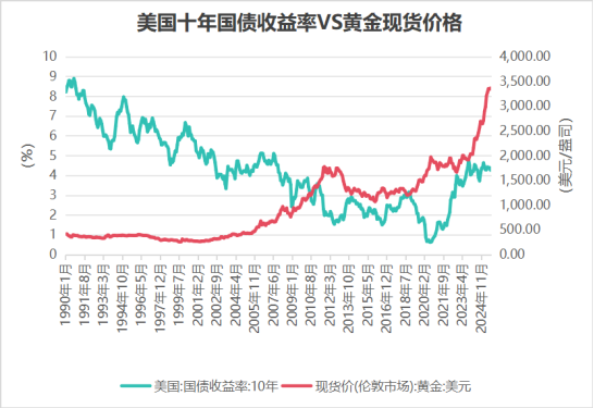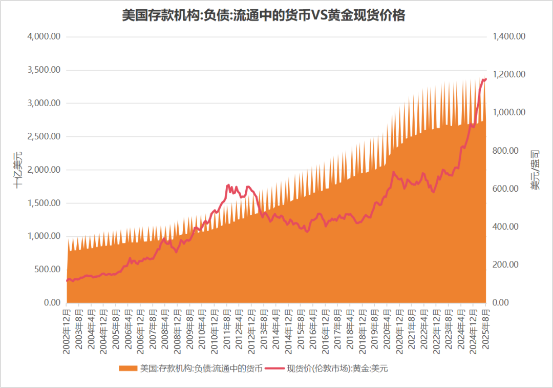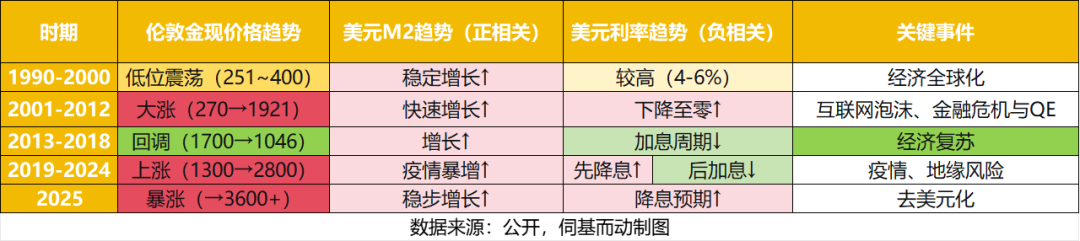 基哥梳理1990年至2025年期间黄金现货价格与美国流通货币量、美元10年期国债利率、美元指数的趋势数据,来探究当前的黄金价格位置。