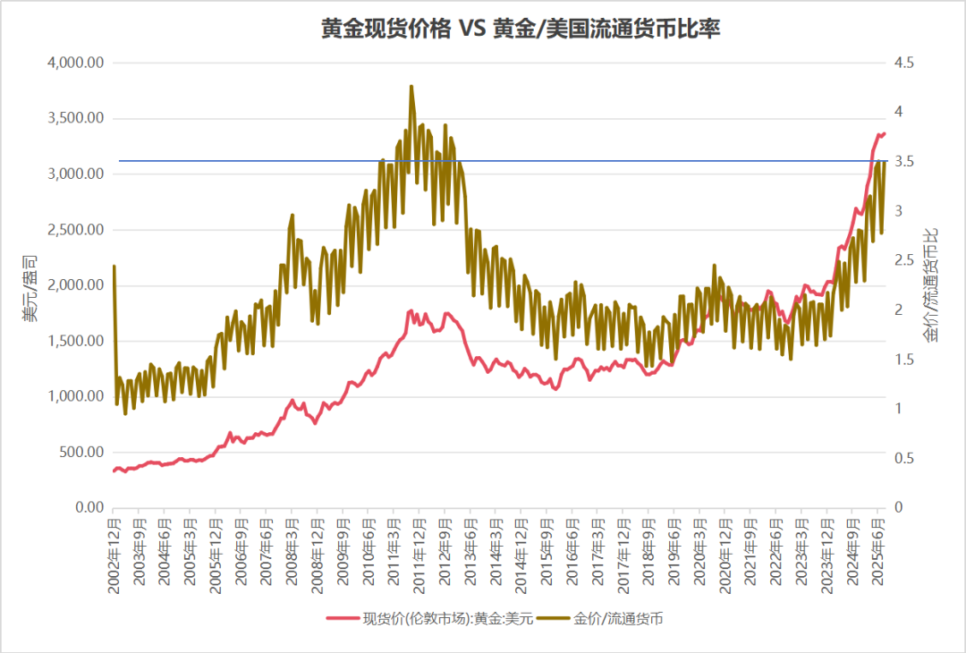 历史比值参考:从金价/美国流通货币比来看,当前比值确实贴近20年高位,但尚有一息安全空间。